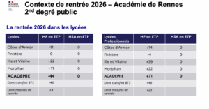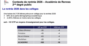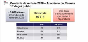 Au niveau de l’Académie de Rennes nous perdrons 3869 élèves à la rentrée prochaine et 86 postes, ce qui conduira à de nombreuses fermetures de classes.