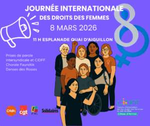 Festival On prend la place, de la Maison des femmes 22, à la Maison du peuple du XXIe siècle, espace Curie, 4, rue Felix-le-Dantec, Saint-Brieuc. Gratuit, sans réservation. Parade à 10 h 15, devant The Roof, 14, rue Pierre-de-Coubertin, 11 h 30 au marché de la croix Saint-Lambert et arrivée à l’espace Curie à 12 h 30. Animations de 13 h 30 à 18 h. Dimanche 15 mars 2026, de 17 h à 20 h, concert de Mathilde, à Bonjour Minuit, réservation sur le site de la Maison des femmes 22. Tarif : 25 € ; réduit 18 €.
